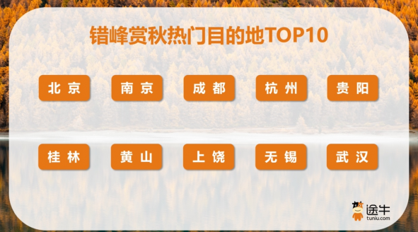 热门目的地方面,北京、南京、成都、杭州、贵阳、桂林、黄山、上饶、无锡、武汉等目的地预订热度位居前列。其中,上饶婺源篁岭的晒秋盛景、南京栖霞山与紫金山的层林尽染、黄山宏村的水墨意境、长沙岳麓山的枫红如火、九寨沟的斑斓彩林、腾冲银杏村的金色童话、桂林龙脊梯田的秋收画卷,均是游客争相打卡的热门之选。