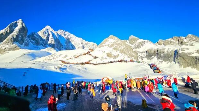 玉龙雪山,是北半球最南端的大雪山,位于丽江市北部,13座山峰南北纵向排列,主峰扇子陡海拔5,596米(尚未被人类登顶)。在纳西语中被称为“欧鲁”,意为“天山”,是纳西族人心中的神山和殉情圣地。