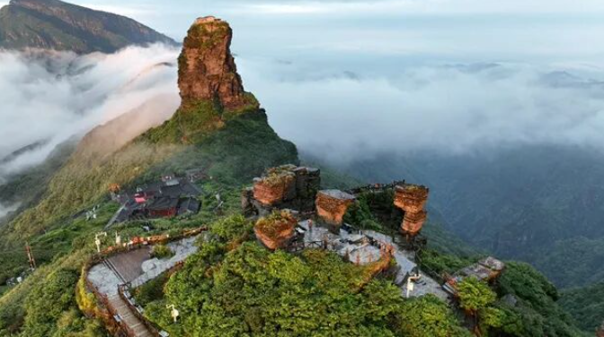 梵净山,主峰凤凰山海拔2,572米,是武陵山脉的主峰。它以其奇特的花岗岩地貌(蘑菇石、金顶)、保存完好的原始森林、丰富的生物多样性以及作为弥勒菩萨道场的佛教文化而闻名,2018年被列入世界自然遗产名录。