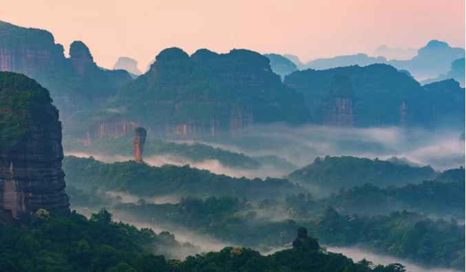 以其独特的丹霞地貌而闻名的丹霞山是世界“丹霞地貌”命名地,由680多座顶平、身陡、麓缓的红色砂砾岩石构成,色彩鲜艳,形状各异。里的山峰虽然海拔不高,但每座都有其独特的魅力。