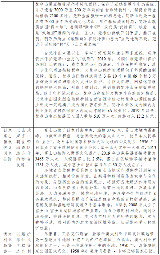 在RCEP的网络上,共有158项世界遗产,占世界遗产总数的13.7%。著名的旅游目的地如中国的泰山和梵净山、老挝的琅勃拉邦、越南的下龙湾、柬埔寨的吴哥窟、缅甸的蒲甘、马来西亚的马六甲名城、印度尼西亚的科莫多国家公园、澳大利亚的卡卡杜国家公园、新西兰的次南极区群岛等等,都被同一张旅游网络织在一起。在这个网络上,已逐渐形成以46项山地世界遗产为主体的世界级山地旅游目的地,形成各具特色的集群化山地旅游产业发展模式。典型代表如表4-1所示。