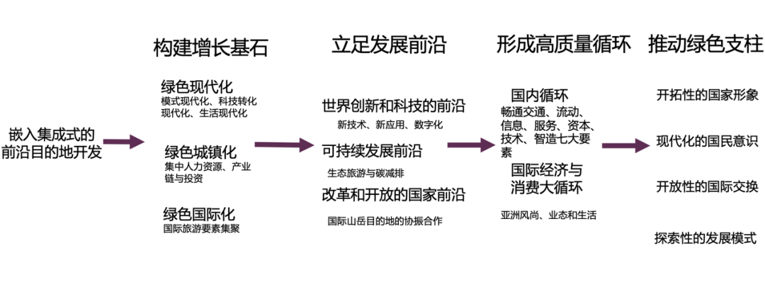 世界级的网络会产生世界级的山地旅游目的地,世界级的山地旅游目的地将支撑世界级的网络。山地是人类文明的摇篮,世界级的山地旅游目的地是国家和区域的山岳文明的集中体现,从中能够看出山岳文明是否深厚,是否有活力,能否高效转化为经济绩效,能否有能力走向未来。世界级的山地旅游目的地,是国家山地文明的传承地,是山地生活的集聚地,是山地旅游经济效能的放大器,是山地文明前沿的试验田。在RCEP框架下,山地旅游为核心的自贸旅游网络的建设,就要构建嵌入集成式的前沿目的地开发模式,以绿色现代化、绿色城镇化、绿色国际化构建增长的基石,立足三个发展前沿,即世界创新和科技的前沿、可持续发展的前沿、改革和开放的前沿,形成高质量的国际旅游消费循环,并以这种模式创新立足RCEP网络,推动开拓性的国家形象、现代化国民意识、开放性的国际交换和探索性的发展模式。
