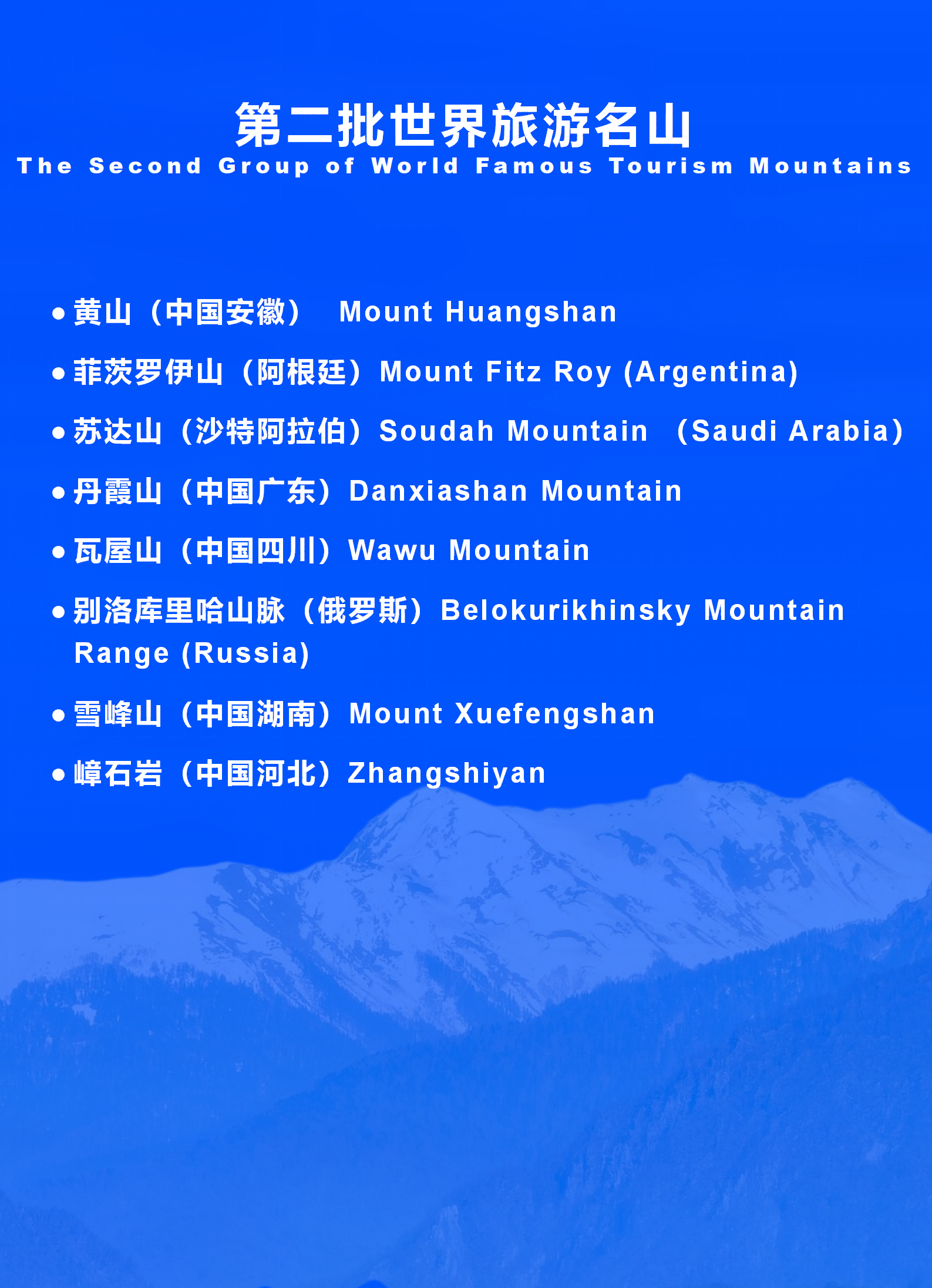 2025年国际山地旅游联盟年会现场公布了通过认定的第二批“世界旅游名山”名单,中国-黄山、阿根廷-菲茨罗伊山、沙特阿拉伯-苏达山、中国-丹霞山、中国-瓦屋山、俄罗斯-别洛库里哈山脉、中国-雪峰山、中国-嶂石岩等8座名山入选。