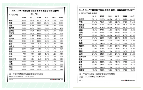 来自全球领先的数字化市场研究服务商eMarketer的上述数据显示,20个热门地区市场中仅有5个市场可以取得6%以上的增长率,在旅游市场消费总额中电子商务销售占比方面,有16个国家出现不同程度的下降。