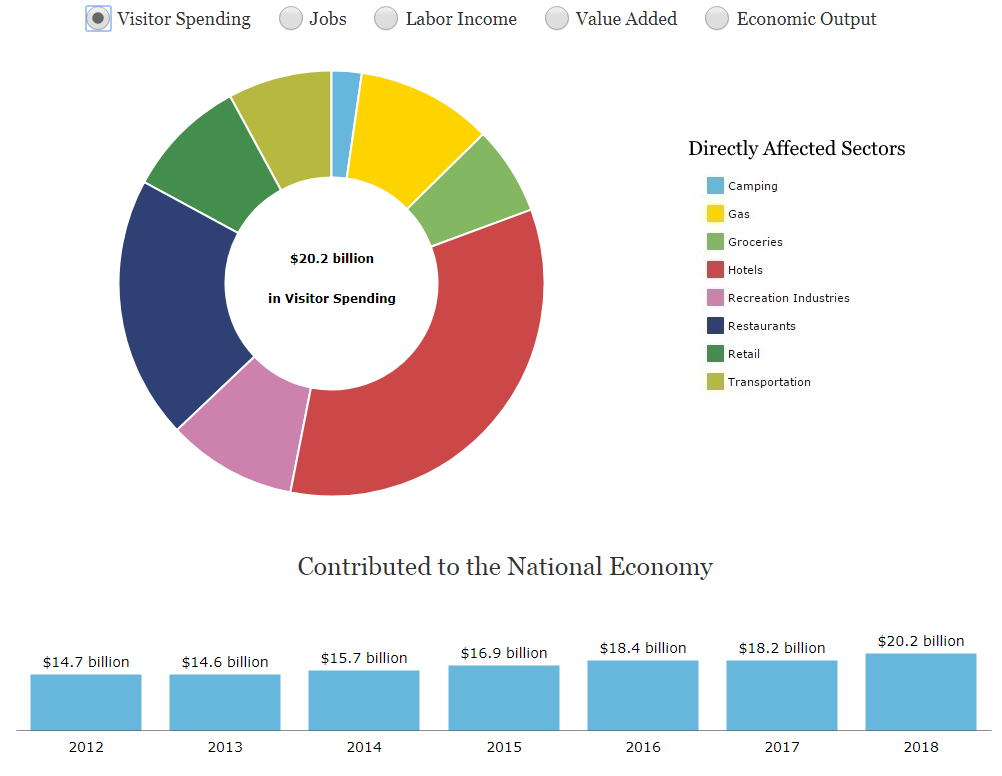 从2012年到2018年,美国国家公园在游客消费、就业、劳动收入、附加值、国民经济产出等方面都保持了逐年增长的态势。2018年,3.18亿人次游客参观了位于美国各地的国家公园,共计花费约202亿美元。这些旅游收入支持了32.9万个就业岗位,实现了136亿美元的劳动收入、234亿美元的附加价值和401亿美元的国民经济产出。